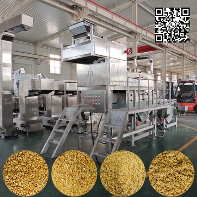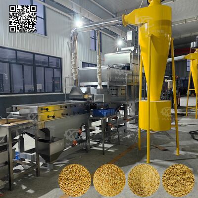 Sistem pemotong dua tahap yang canggih dimulai ketika kacang putih terbelah diberi makan melalui konveyor vertikal. Bahan pertama dipotong menjadi butiran kasar oleh perangkat pemotong awal,kemudian mengalir ke tahap kedua untuk menjadi granulator pencampuranDengan penggaris getar terintegrasi, bahan yang dipotong disortir menjadi 4 spesifikasi seragam, biasanya dibagi menjadi 5-8 mesh, 8-10 mesh, 10-12 mesh,dengan bahan kurang dari 12 mesh mencapai tekstur bubuk.